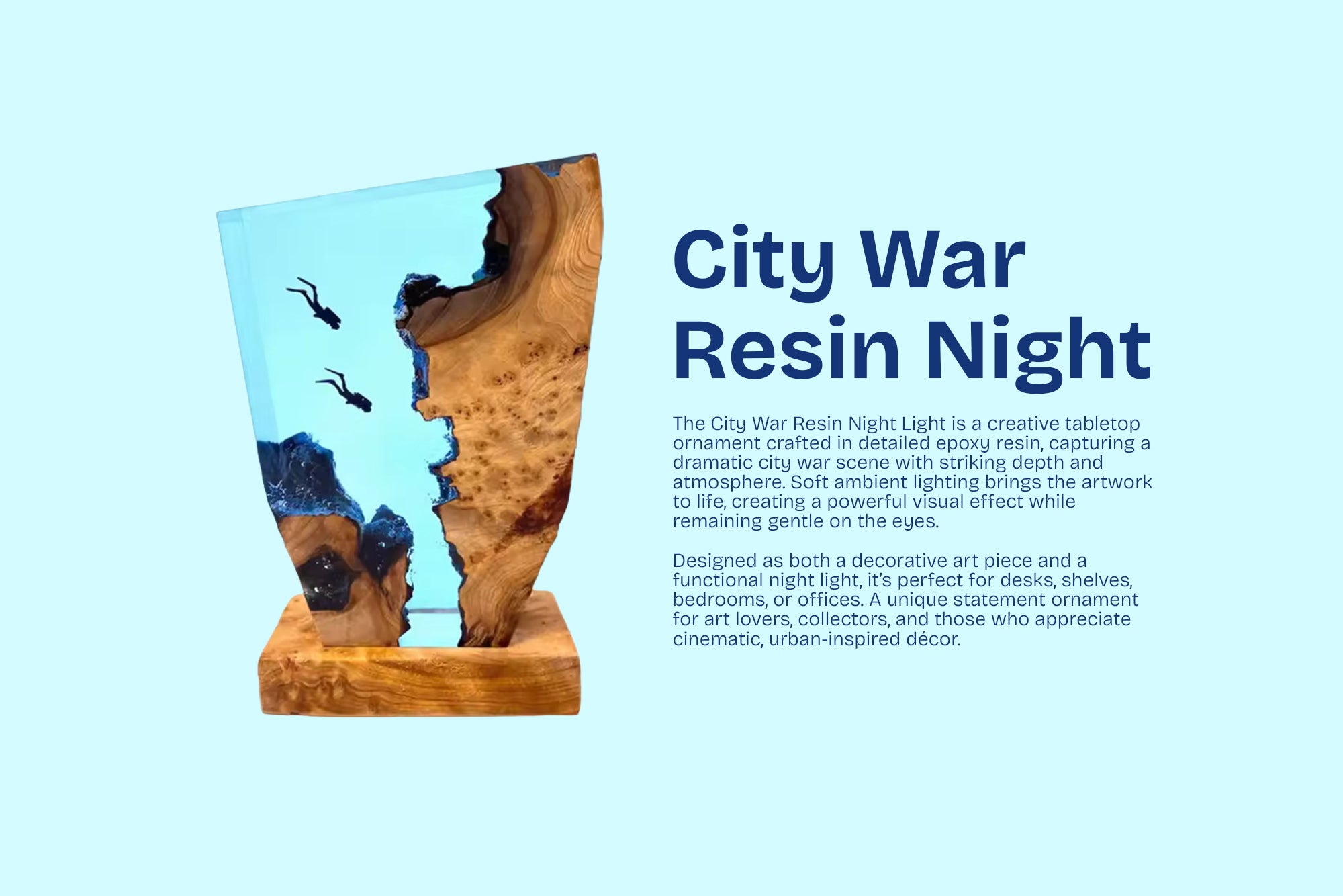The City War Resin Night Light is a creative tabletop ornament crafted in detailed epoxy resin, capturing a dramatic city war scene with striking depth and atmosphere. Soft ambient lighting brings the artwork to life, creating a powerful visual effect while remaining gentle on the eyes.